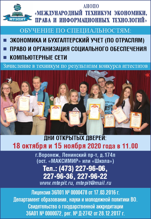 Реклама МЕЖДУНАРОДНЫЙ ТЕХНИКУМ ЭКОНОМИКИ, ПРАВА И ИНФОРМАЦИОННЫХ ТЕХНОЛОГИЙ, АНОПО из Справочника служебных телефонов Воронежа. Издательство АВЕГА