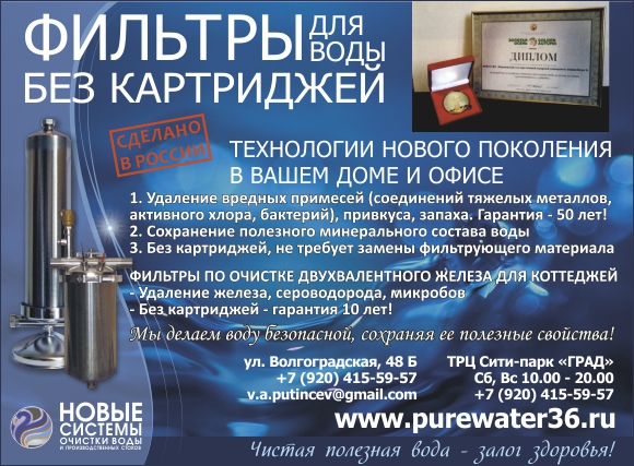 Реклама ФИЛЬТРЫ БЕЗ КАРТРИДЖЕЙ из Справочника служебных телефонов Воронежа. Издательство АВЕГА